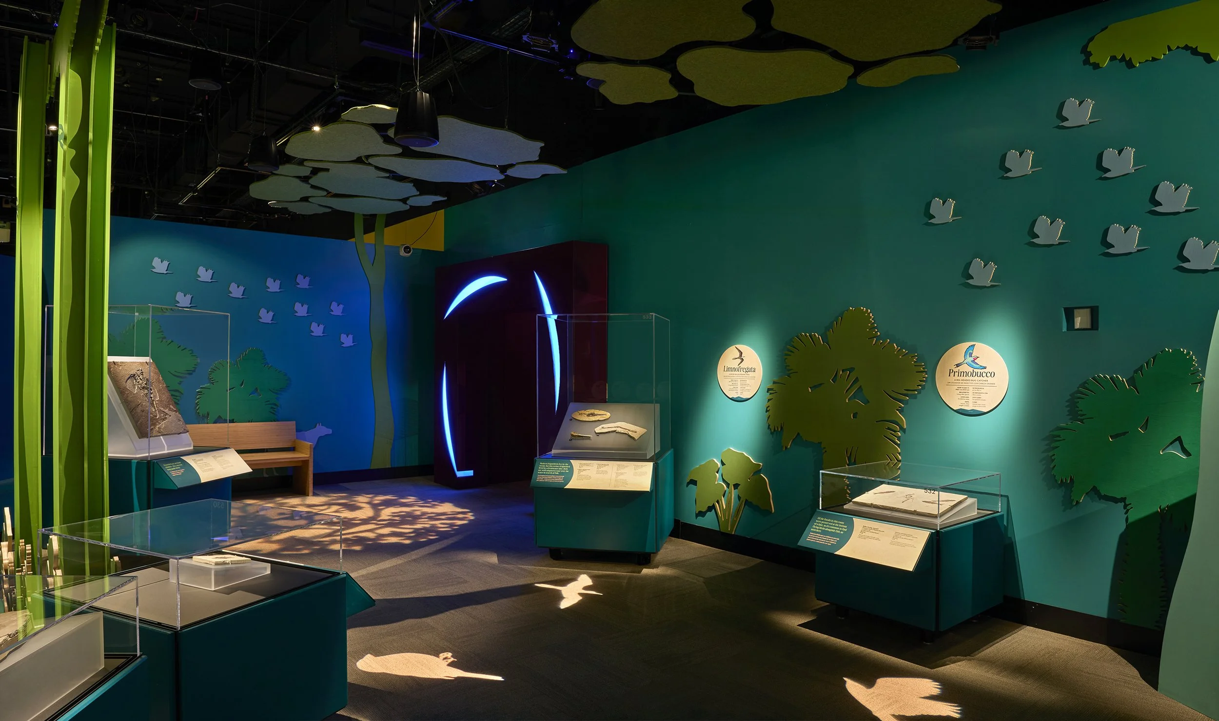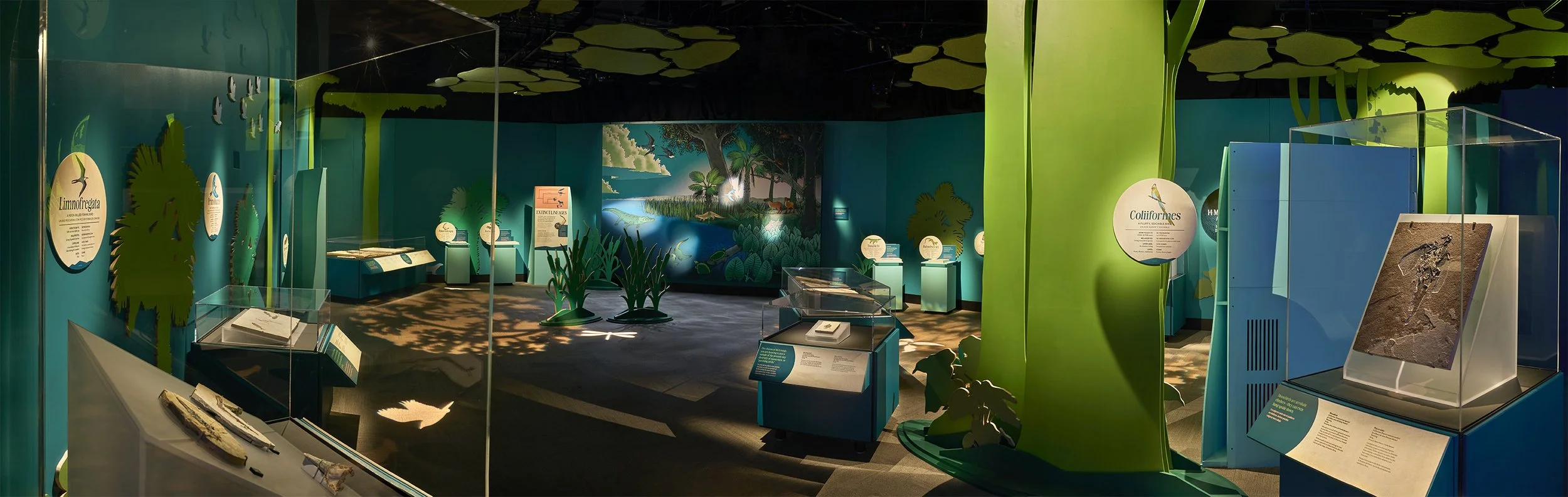 I led the creative direction for the Green River interactive audio gallery, shaping a multi-sensory environment where sound, art, and fossils worked in harmony. To create interactivity, I developed a system where visitors walking across animal-shaped gobo lights triggered 11 distinct sound effects—from the calls of birds and bats to the croak of frogs and the movement of crocodiles and dragonflies. Each sound was paired with nearby fossils, creating a direct connection between the echoes of ancient life and its preserved remains. To enrich the atmosphere, I collaborated with composer Jesse Solomon Clark, who composed an evolving soundscape that served as the natural backdrop, weaving individual triggers into a living ecosystem. Artist Jay Ryan contributed a painted mural of Green River animals, which we enhanced with hidden speakers—so that the illustrated crocodile, bird, mammal, and frog seemed to come alive through sound.