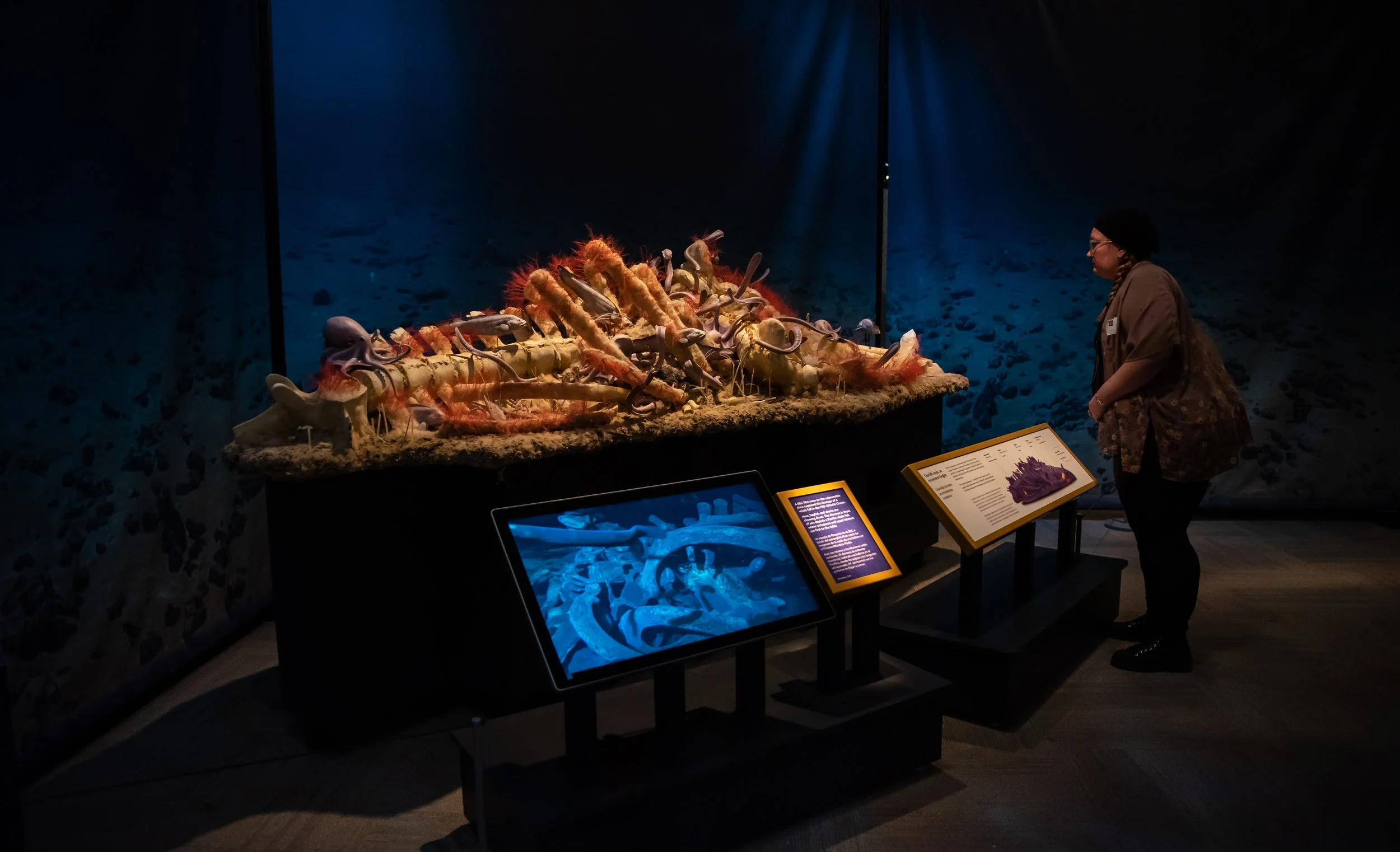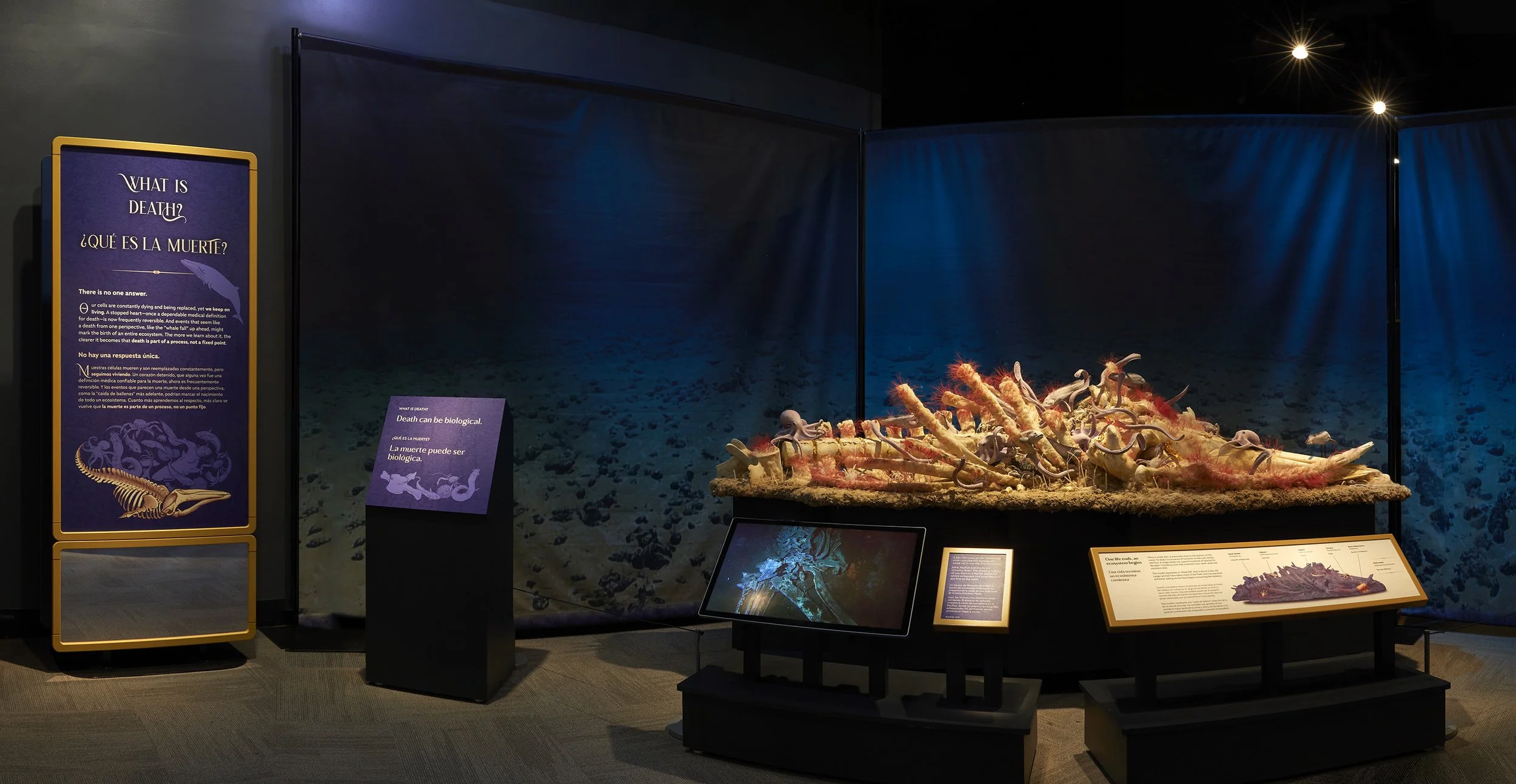 To ground these representations in the natural world, the piece transitions to footage of marine life feeding on a whale fall. This moment serves as a visceral counterpoint: death not only as an end, but as transformation and sustenance. The juxtaposition reinforces the exhibition’s central idea—death as an essential, generative force within life cycles.